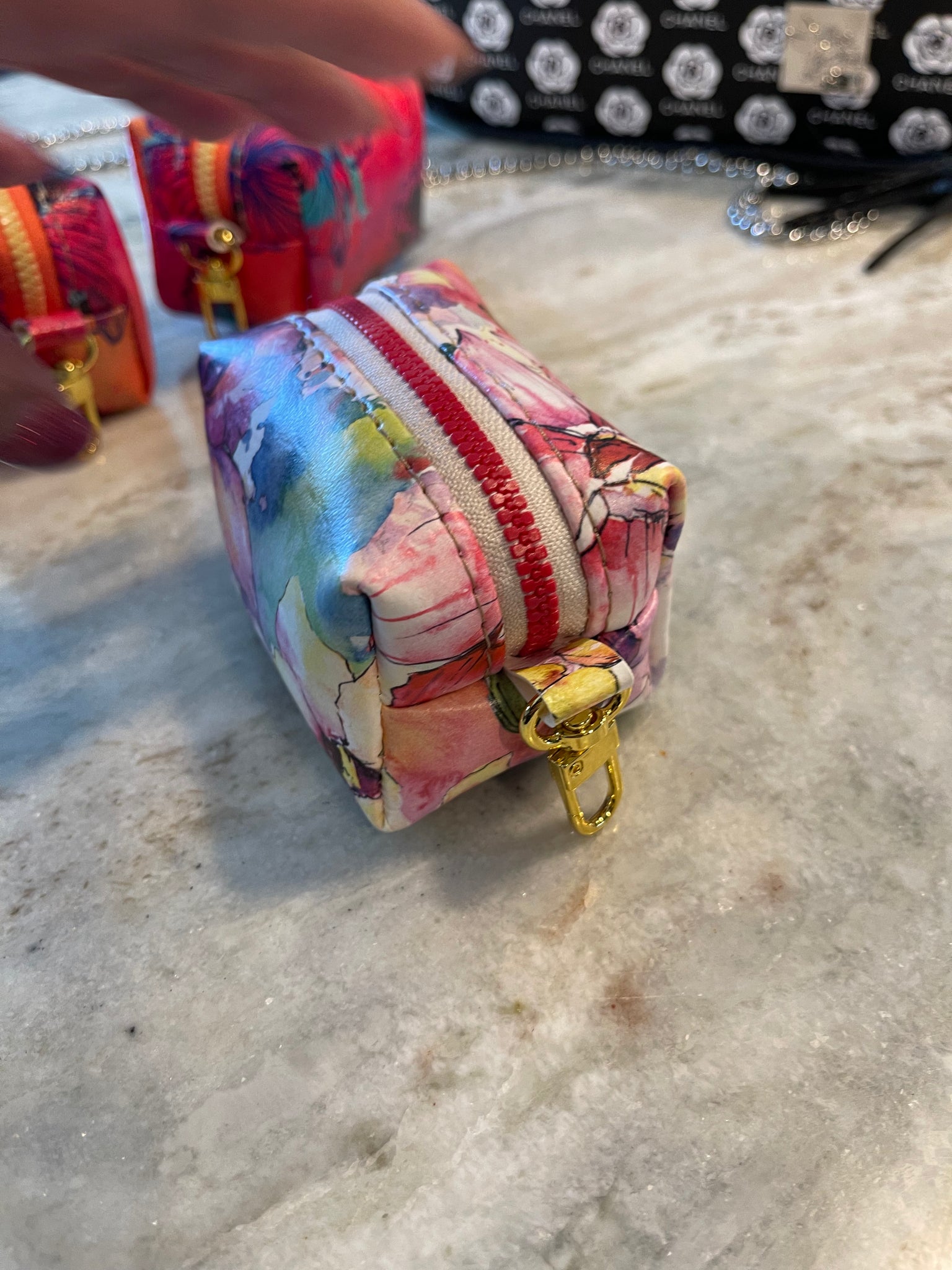 3" x 3" x 2" Zippered pouch with a swivel clip to attach to your bag or keychain. Perfect for AirPods, phone charger or jewelry.